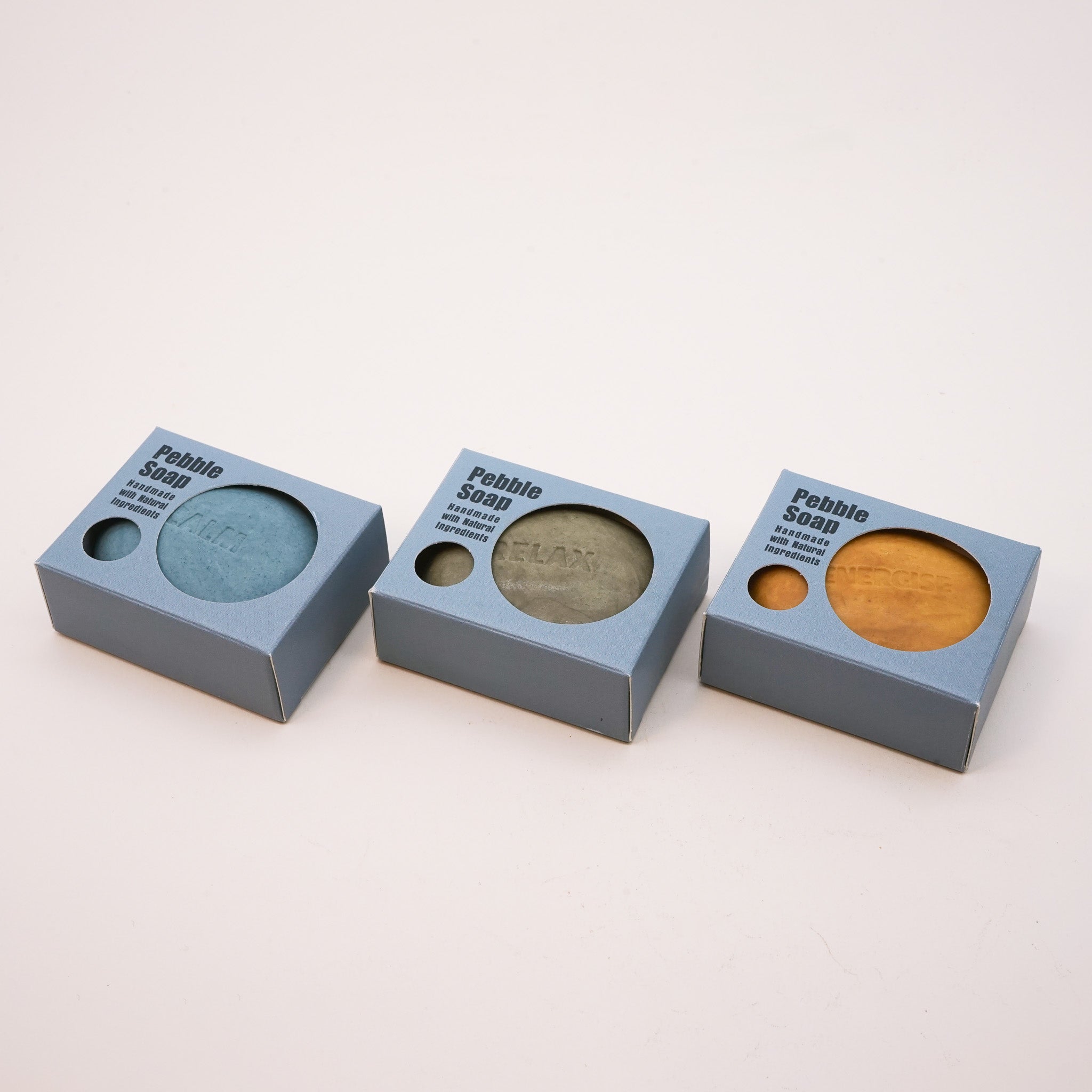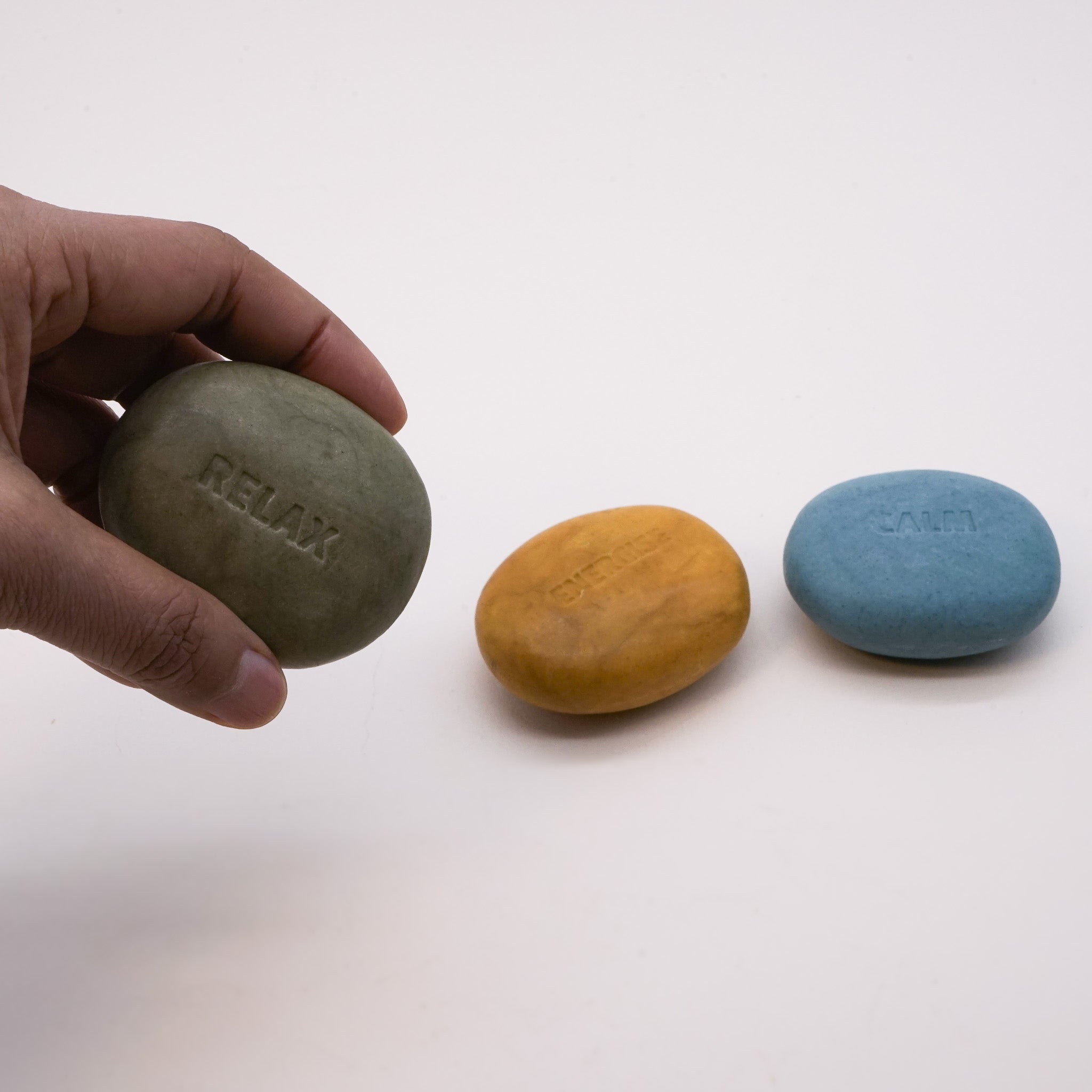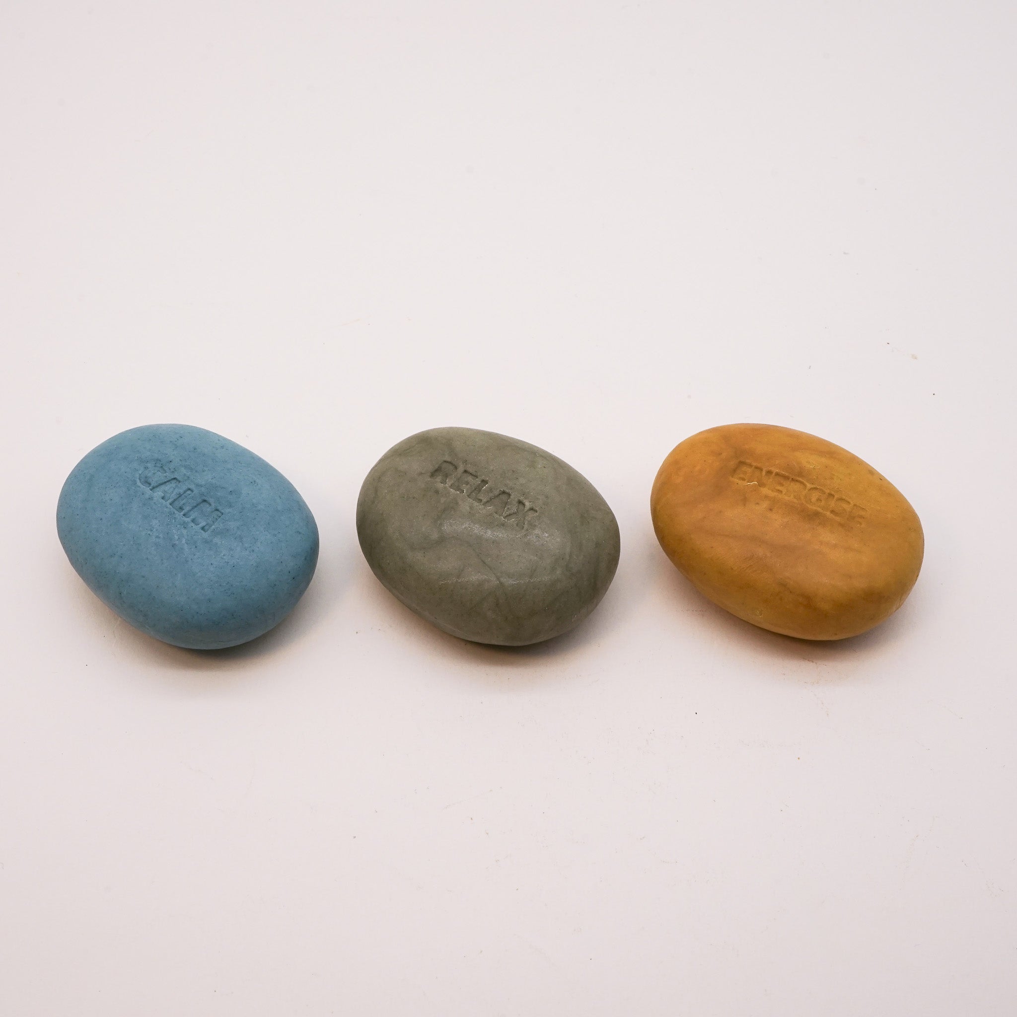 Each soap is shaped into a smooth, tactile pebble that fits comfortably in the palm of the hand and features an engraved "mood" - Relax, Calm, Energise to set the intention for the day.